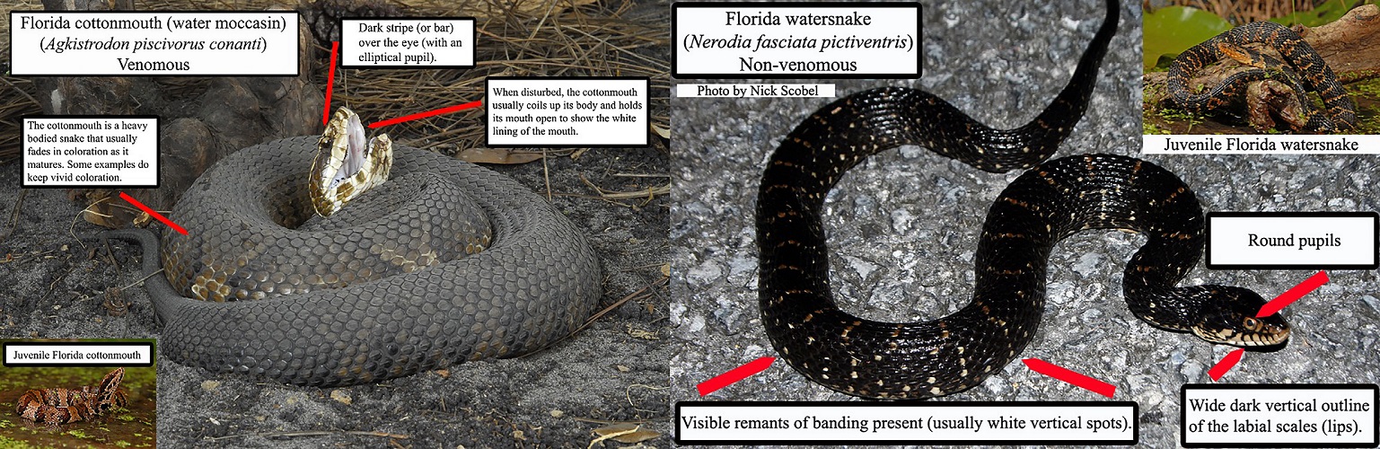 The Florida cottonmouth (usually 3 -5 ft) as compared to the nonvenomous watersnakes of Sanibel: