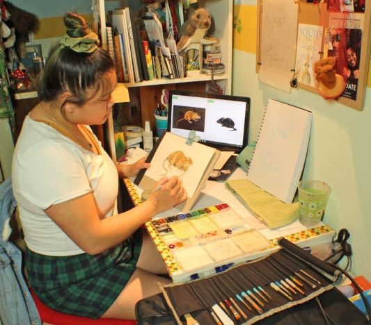 For now, we will introduce you through a photograph of Sami in her home studio in San Ramon, California. Here she is diligently working on an illustration that depicts the morphological differences between Sanibel’s native rice rat (Oryzomys palustris sanibeli) and the introduced black/palm rat (Rattus rattus).