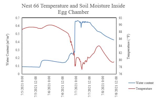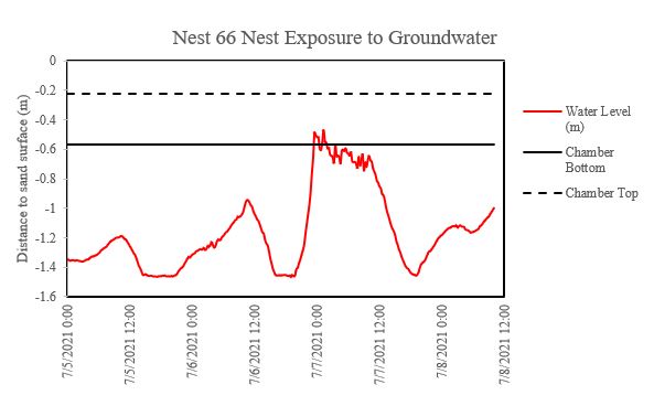 SCCF data loggers captured the water level, temperature, and moisture changes inside 38 nest chambers during the tropical storm. It is evident that the storm surge and heavy rain caused the bottom of this particular nest to become inundated for about three hours. Nests can withstand some degree of wash-over during incubation but standing water can negatively impact hatching success.