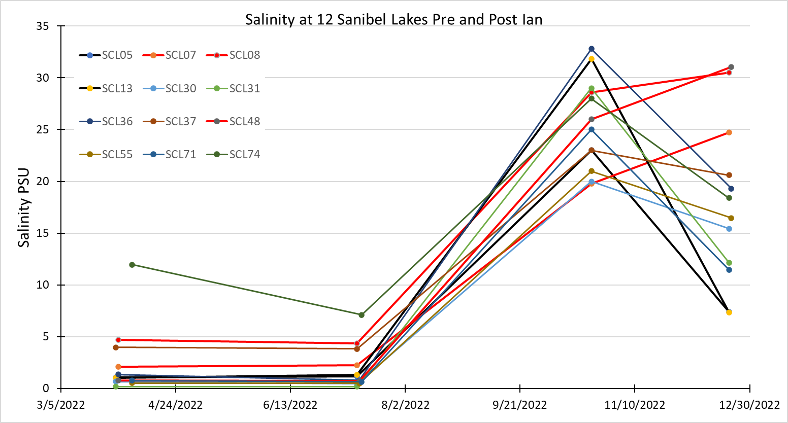 The SCCF Marine Lab is testing lakes on Sanibel for salinity pre and post-Ian, measured in practical salinity units (PSU). For reference, the salt content of the Gulf of Mexico is 30-35 PSU. Freshwater is considered to be 0-1.5 PSU.