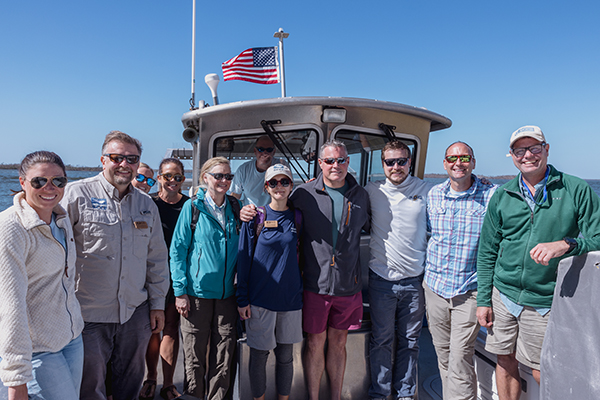 Known for starring in ABC’s “Wildlife Nation” and “Ocean Treks,” among many others, Corwin is an award-winning conservationist, producer, speaker, author, and journalist. Prior to his speech at the Marriott Sanibel Harbour Resort & Spa, Corwin spent some time interacting with SCCF staff on our research vessel, the Norma Campbell. The group ventured to Captiva to look for the rare Eastern Indigo Snake (Drymarchon couperi) — which SCCF biologists routinely track and monitor — and anchored at Hemp Key to bird watch and discuss SCCF’s restoration efforts over lunch.