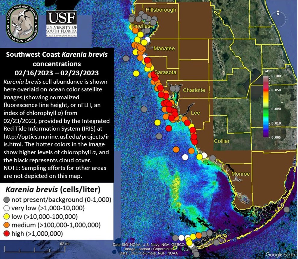 As Southwest Florida continues to rebuild in the wake of Hurricane Ian, a second natural disaster is slowing the path to economic recovery. Red tide remains high in the region, with bloom concentrations of over 100,000 cells/liter detected in seven counties, including high concentrations inshore and offshore of Lee and Collier Counties. Red tide alerts have been issued by the Florida Department of Health in Lee County on Sanibel, Captiva, Fort Myers Beach, and Boca Grande Pass.