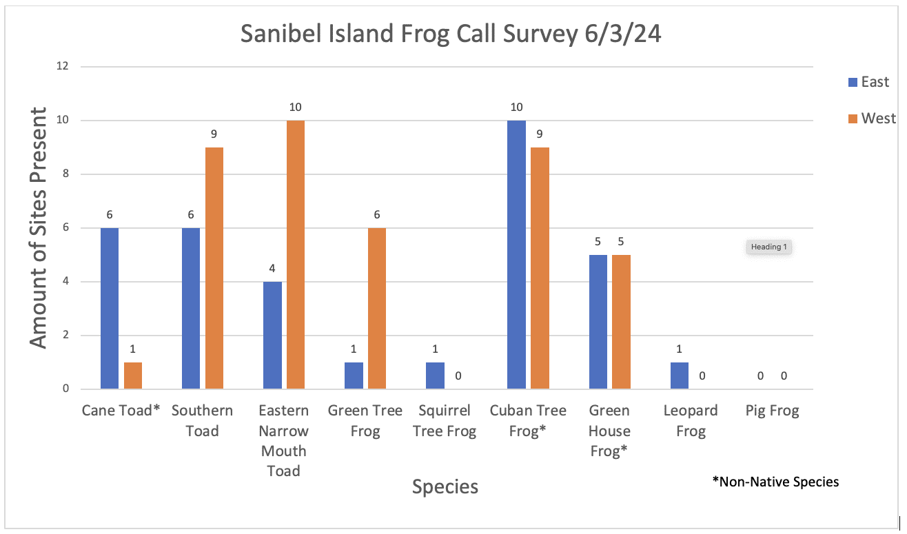 The pig frog (Lithobates grylio), which was the species of most concern on the island after Ian, was not heard during these surveys. However, they were verified to be in existence through a frog call survey at the end of the 2023 wet season.