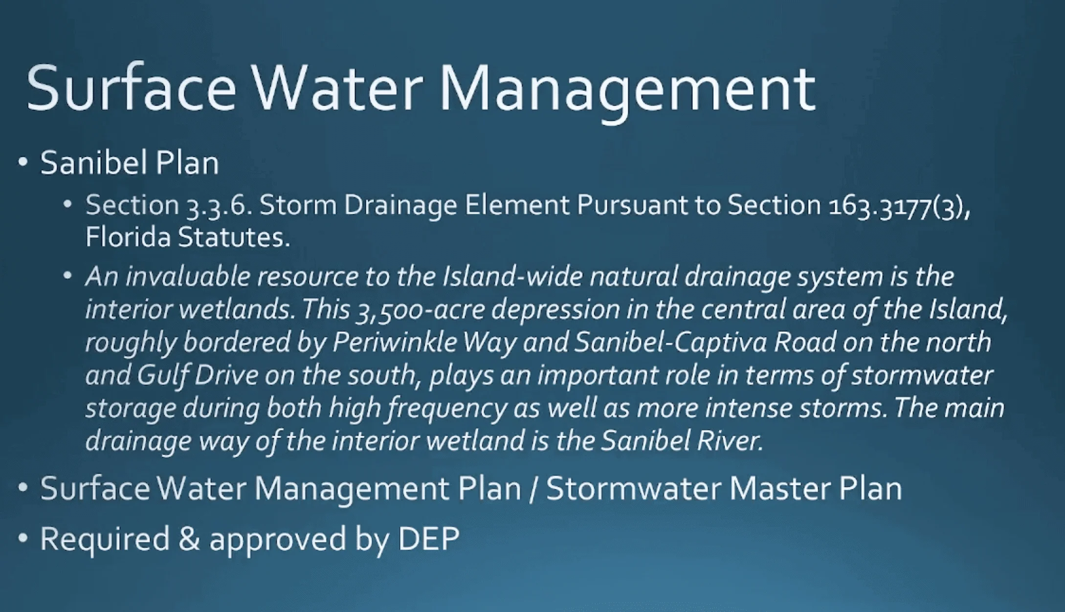 “An invaluable resource to the island-wide natural drainage system is the interior wetlands. This 3,500-acre depression in the central area of the island…plays an important role in terms of stormwater storage during both high frequency as well as more intense storms,” she said, quoting the Sanibel Plan.