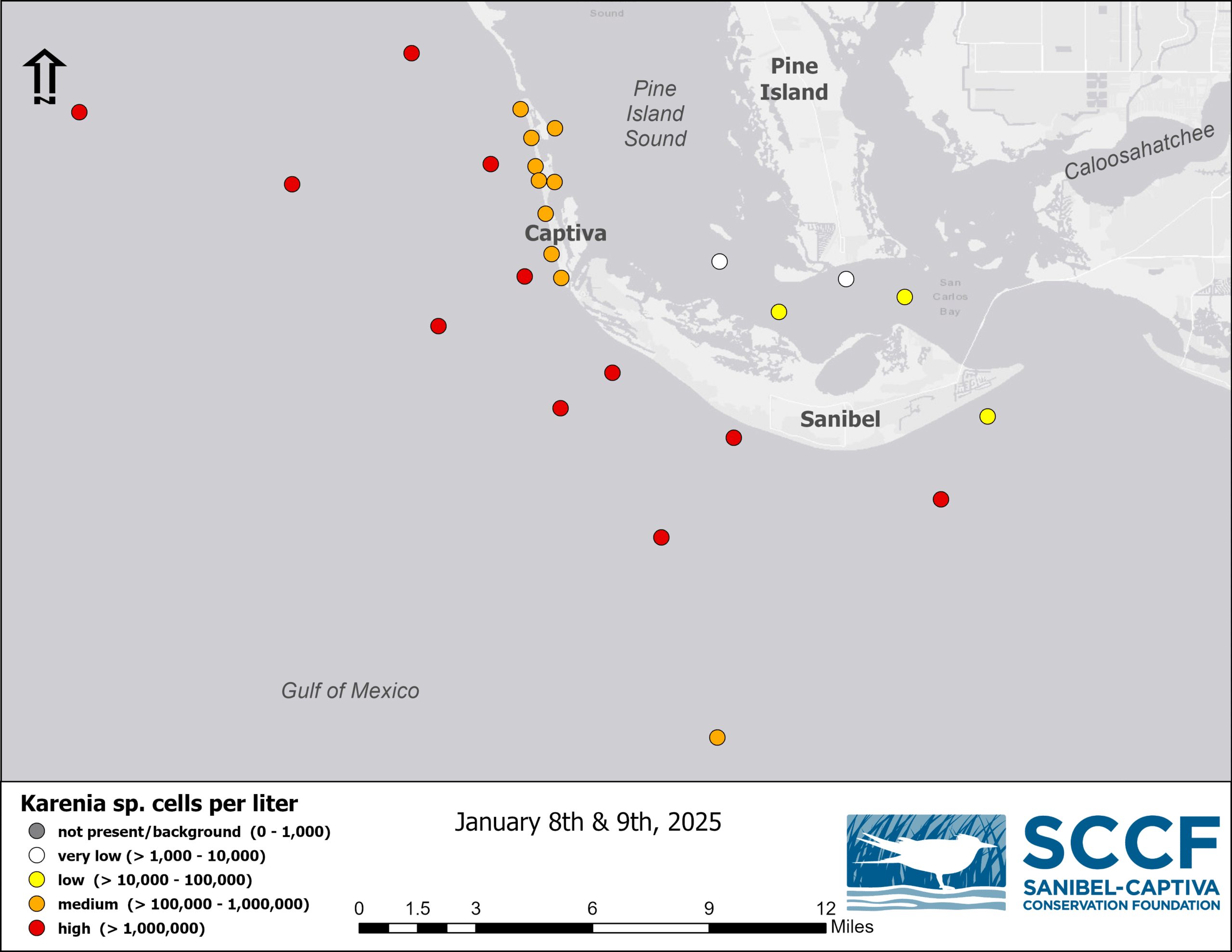On Sunday evening and Monday morning, SCCF Marine Lab scientists found very high levels of Karenia brevis, the organism that causes red tide, at Algiers Beach and Tarpon Bay Road Beach.