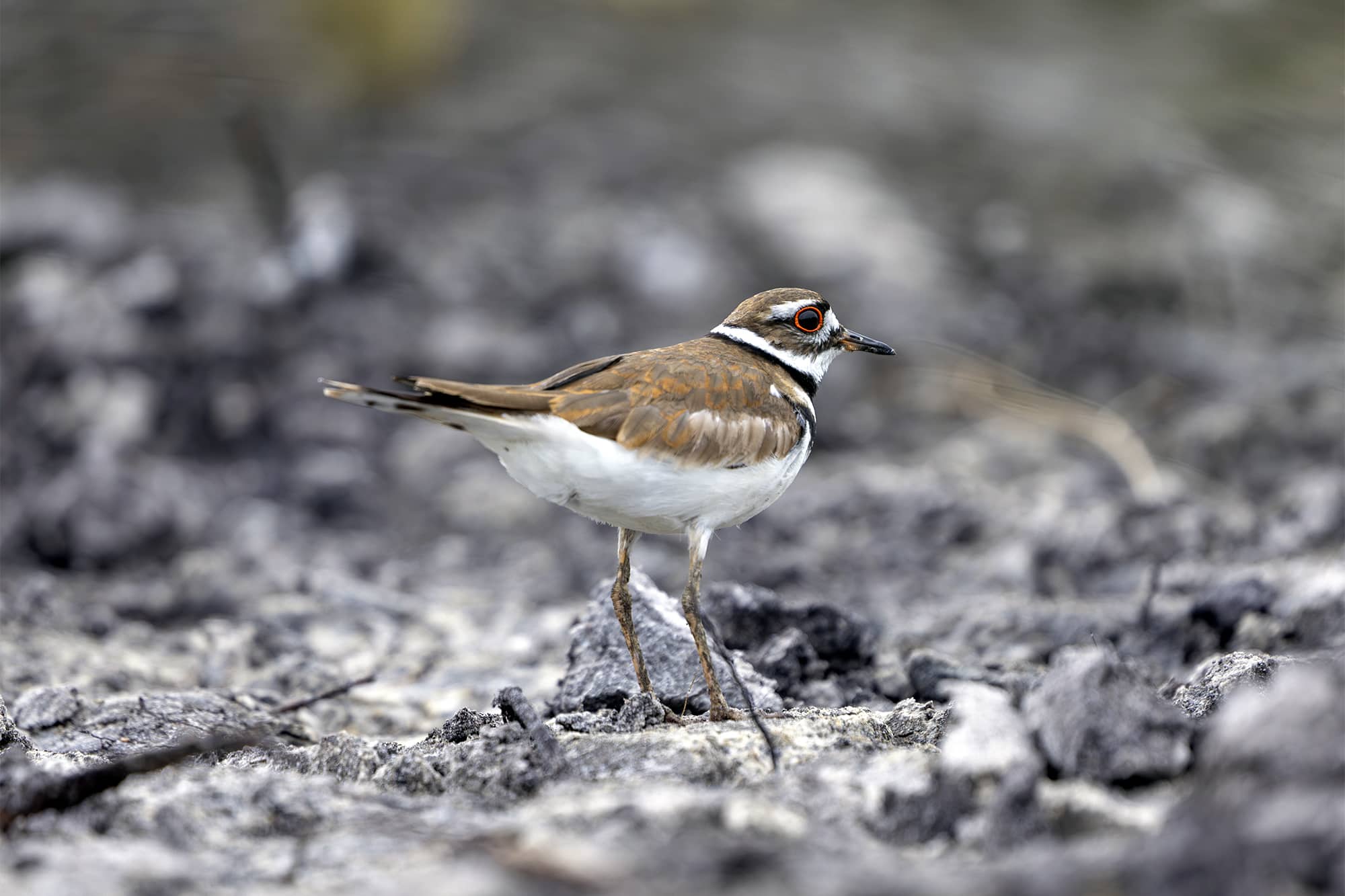 Killdeer (Charadrius vociferus) are a plover species that can be found year-round in Florida as well as across the United States, Caribbean, and Central America. They are eye-catching birds with tan-brown and white plumage, two black chest bands, and bright orange eye rings.